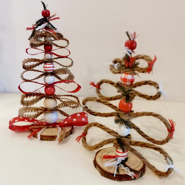 Ένα φύλλο ξύλου για βάση, ξύλινες χάντρες σε διάφορα σχέδια και χρώματα, κορδέλες, κλωστές, φυσικό σχοινί και έμπνευση συνθέτουν αυτά τα δύο σχέδια Χριστουγεννιάτικων Δέντρων!