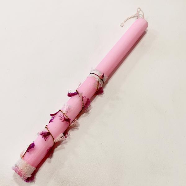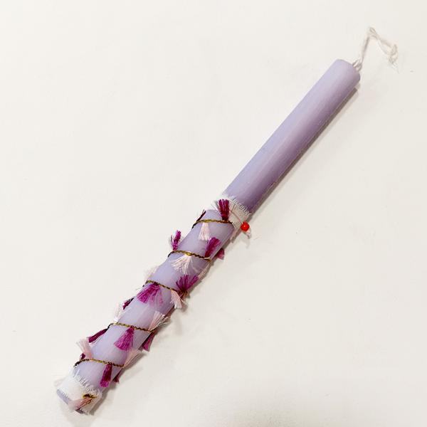 Φυσική κορδέλα λευκή δένει την αναρριχώμενη κορδέλα μας με ιριδίζουσες μωβ και ροζ φουντίτσες! Λαμπάδα με στυλ, που θα κρατάς εσύ!