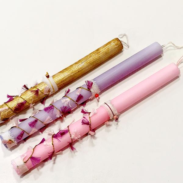 Ροζ και μωβ κερί 30 εκ και χρυσό κερί 25 εκ. γίνονται λαμπάδα minimal και λαμπερή!
