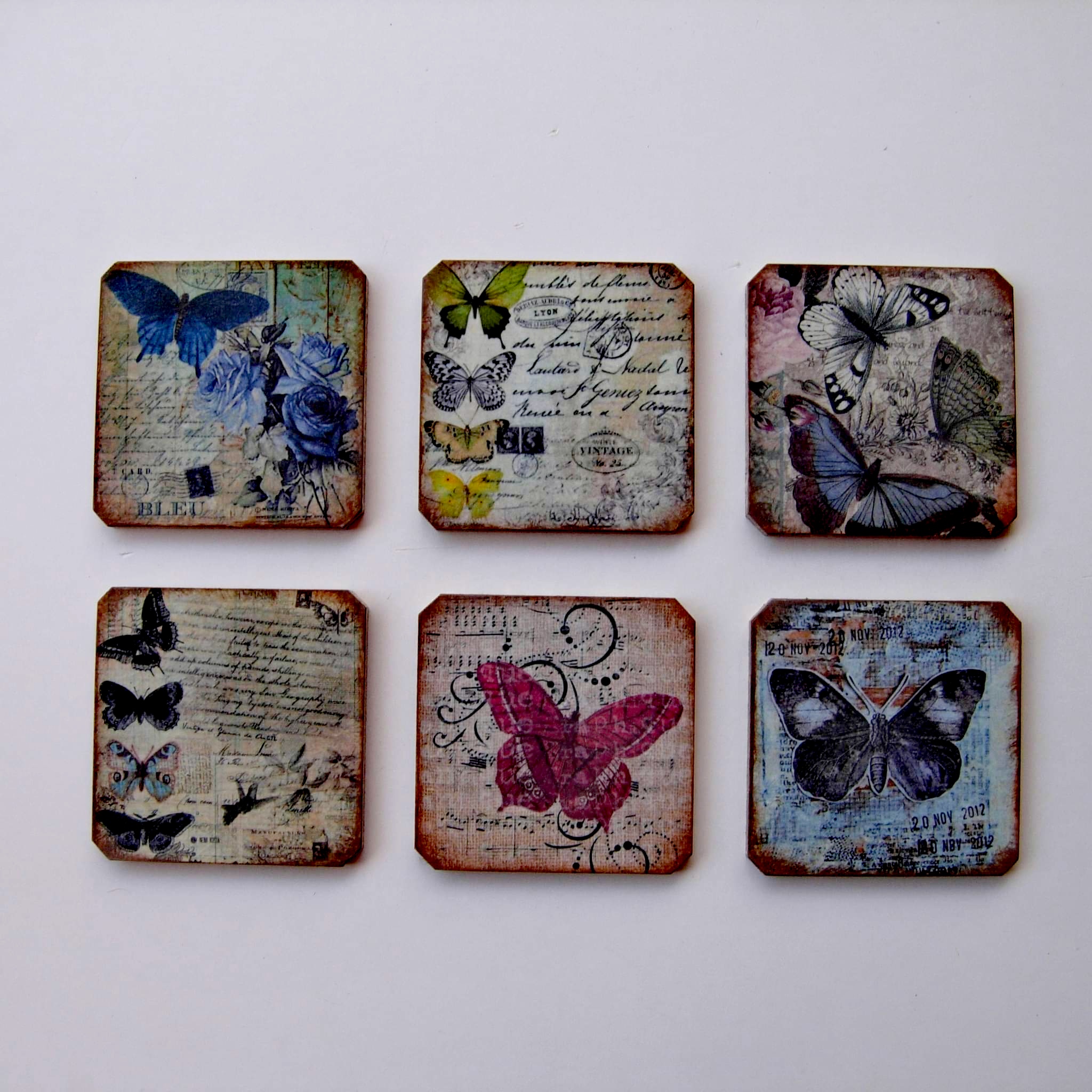 Μια εξάδα από χειροποίητα ξύλινα σουβέρ.